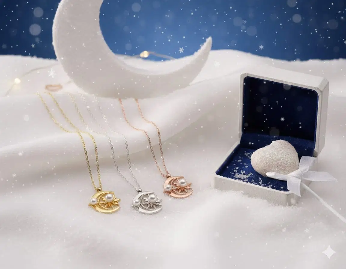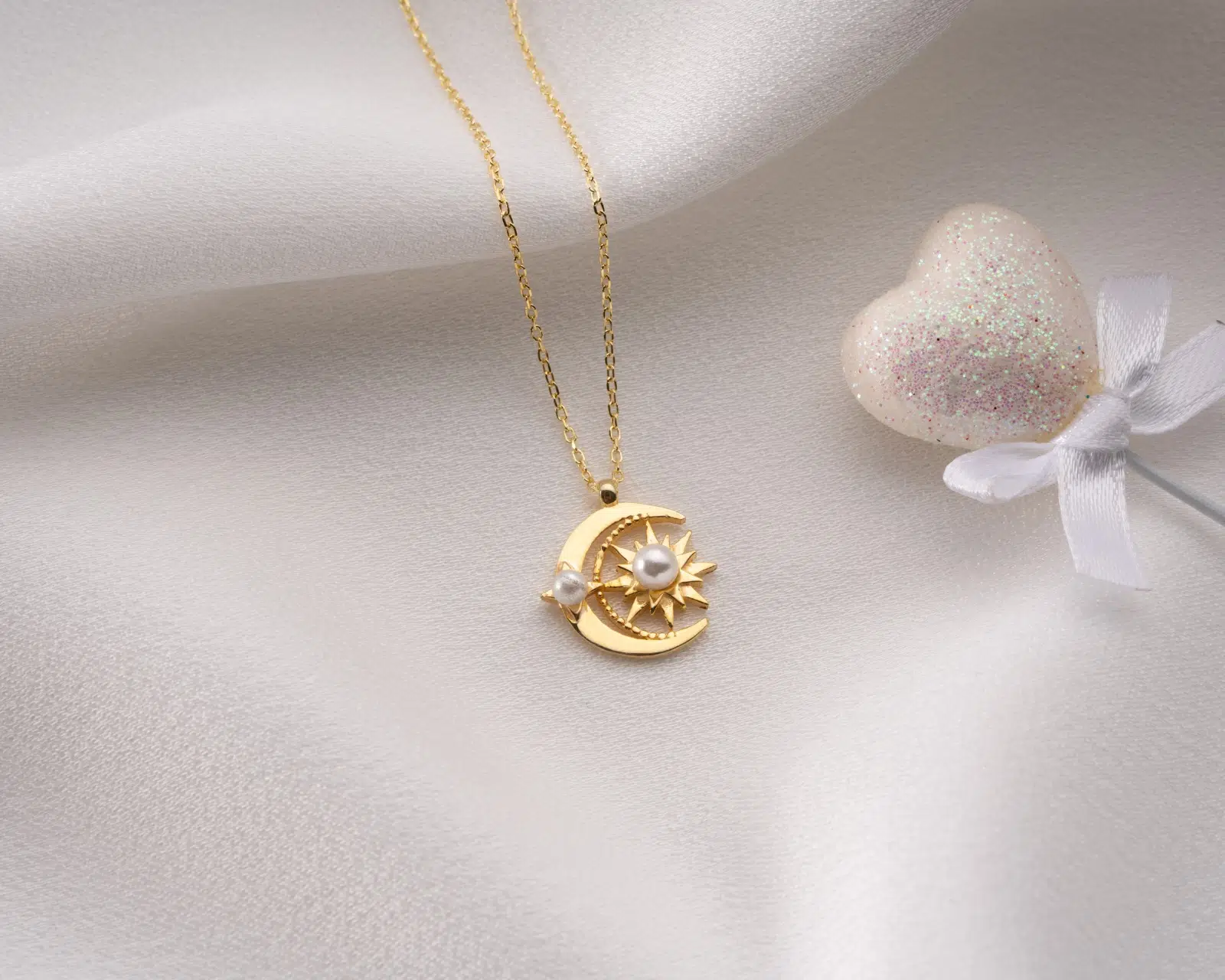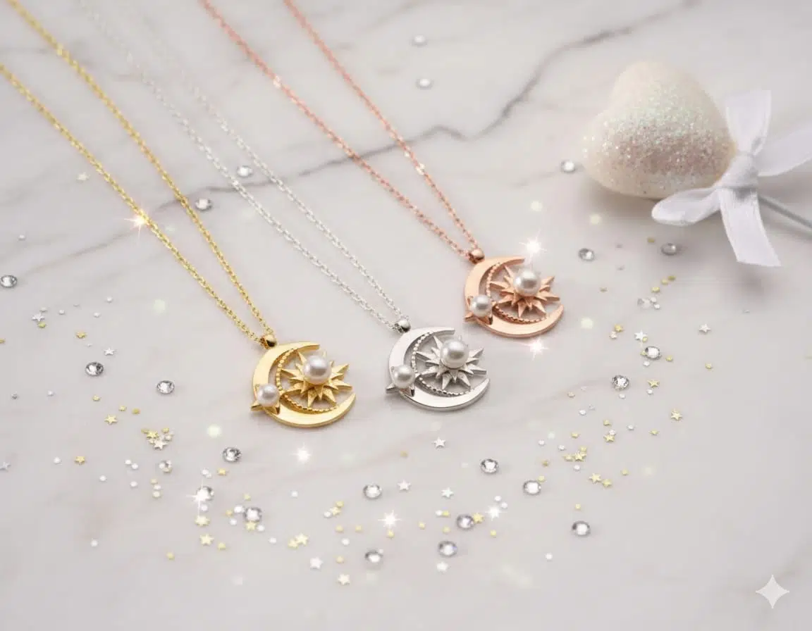 925 Ayar Ay Güneş Beyaz İncili Kolye.rose.gold.rodaj