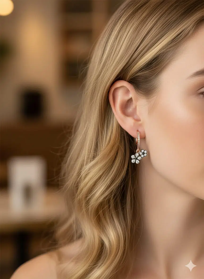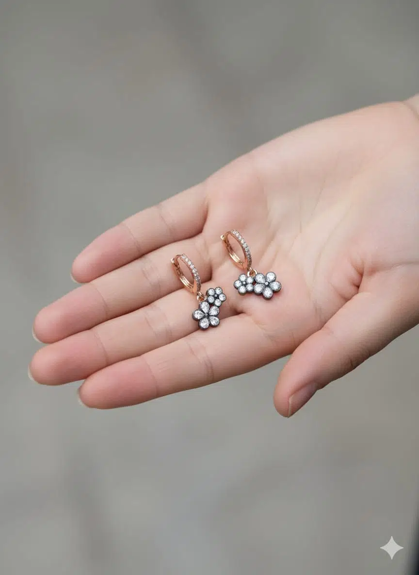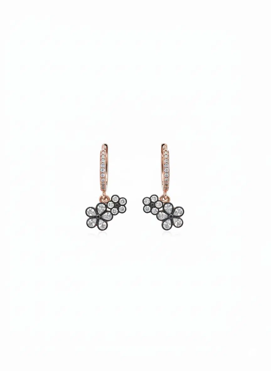 925 Ayar elmas taşlı çiçek küpe.elmas montürlü çiçek küpe.rose.gold.rodaj